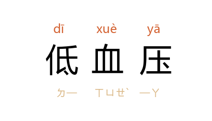 ⒈ 血压指心脏收缩后,血液流经动脉对管壁所产生的压力。若其收缩压在一百毫米汞柱,舒张压在六十毫米汞柱以下,称为「低血压」。可分为因严重感染、循环失调或大出血引起的低血压及体质性低血压,后者以瘦子居多,并非疾病。