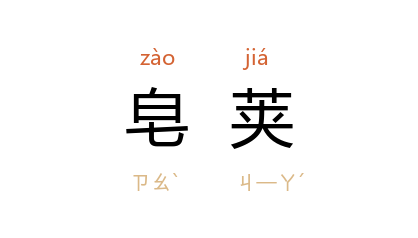 ⒉ 落叶乔木,枝干上有刺,开淡黄色花,结荚果。荚果富胰皂质,可去污垢。荚果、树皮和刺均可入药,有祛痰功能。也称皂角。