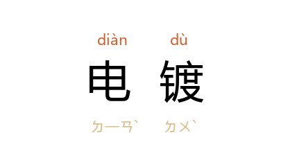 ⒈ 利用电流将金属沉积于导体(如金属)或非导体(如塑胶制品、皮革、木材)的表面,而形成金属涂层的过程。非导体的表面要先用石墨、导电漆等方法,使形成导电层后才能加以电镀。电镀有镀铜,用来防止钢材渗碳时硬化;镀银用于餐具及电器接点中;镀金用于装饰品及表壳的美化;镀锌是用于防止钢铁制品表面生锈;镀镍和镀铬则用于制造汽车和家庭用品。