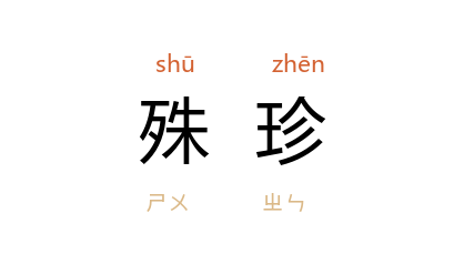 引晋 刘琨 《答卢谌》诗:“音以赏奏,味以殊珍。”晋 张协 《七命》:“六禽殊珍,四膳异肴;穷海之错,极陆之毛。”《宋史·外国传五·占城》:“臣生居异域,幸遇明时,不贵殊珍,惟贵良马。”