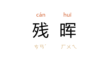 引南朝 梁 范云 何逊 《范广州宅联句》:“昔去雪如花,今来花似雪。濛濛夕烟起,奄奄残暉灭。”唐 狄焕 《送人游邵州》诗:“渔家侵迭浪,岛树挂残暉。”五代 谭用之 《渭城春晚》诗:“折柳且堪吟晚槛,弄花何处醉残暉。”