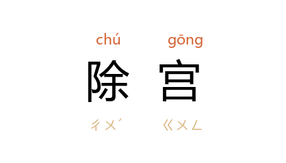 ⒈ 清除宫室。喻宫廷易主。 《汉书·周勃传》:“东牟侯 兴居,朱虚侯 章 弟也,曰:‘诛诸 吕,臣无功,请得除宫。’乃与太僕 汝阴 滕公 入宫…… 滕公 召乘舆车载 少帝 出。
