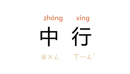 ⒈ 行为合乎中庸之道的人。泛指中庸之道。复姓。中列。中军。中等德行。唐·宋时,尚书省分六部为三行。以兵、吏及左右司为“前行”,刑、户为“中行”,工、礼为“后行”。见宋·王溥《唐会要·尚书省诸司上》。