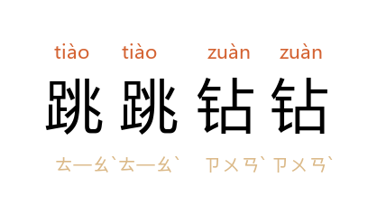 引《儿女英雄传》第三八回:“程相公 听了这话大乐,连那个 麻花儿 听见逛庙也乐的跳跳钻钻。”老舍 《老张的哲学》第三十:“李应 看着炉中的火苗,跳跳钻钻的像一群赤着身的小红鬼。”冰心 《往事·六一姊》:“姑娘家跳跳钻钻的,也不怕人笑话!”