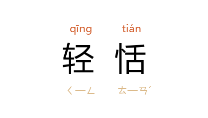 引《韩非子·解老》:“所谓廉者,必生死之命也,轻恬资财也。”《韩非子·解老》:“夫内无痤疽癉痔之害,而外无刑罚法诛之祸者,其轻恬鬼也甚。”陈奇猷 集释:“恬,淡也。 《忠孝篇》:‘恬淡,无用之教也。’以恬淡连文可证。此文轻恬,犹言轻淡也。上文‘轻恬货财’,轻恬与此轻恬同。”