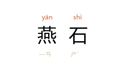 ⒉ 亦称“燕珉”。《太平御览》卷五一引《阙子》:“宋之愚人得燕石于梧台之东,归西藏之,以为大寶。周客闻而观焉,主人端冕玄服以发寶,华匮十重,缇巾十袭。客见之,卢胡而笑曰:'此燕石也,与瓦甓不异。'主人大怒,藏之愈固。”后以“燕石”喻不足珍贵之物。