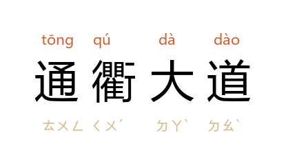 ⒈ 同“通衢广陌”。叶文玲《“殿堂”稚语》:“呵,在千山万岳中,一点一点炸掉它,挖出一条通衢大道是何等的艰难!”
