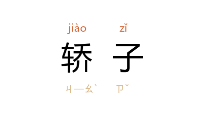 ⒈ 一种旧时的交通工具。方形,通常用木头或竹子制成,外罩布帷,轿身两边各有一根杆子穿过,须由人在前后抬著走。