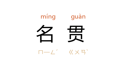 引《魏书·卢同传》:“其实官正职者,亦列名贯。”清 王士禛 《池北偶谈·谈异七·心头小人》:“唱崑曲,音节殊可听;説白自道名贯,一与己合。”清 吴敏树 《书谢御史》:“引见时,唱陈名贯毕,皇上问曰:‘汝 湖南 人,作京语何也?’”