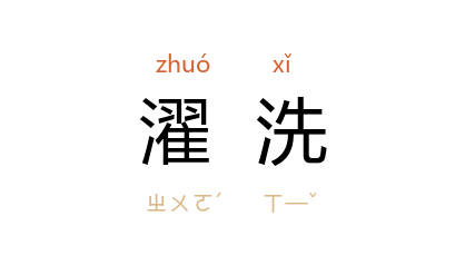 引北魏 郦道元 《水经注·济水一》:“乃使使者以梓宫招魂幽野,於是丹虵自水濯洗,入於梓宫,其浴处有遗髮焉。”宋 周密 《志雅堂杂钞·阴阳算术》:“江 西一术者,其言极神。前日来,尝扣之。云此人不出今年必再来,尚可濯洗一番,然自此以往,凶不可言矣。”《<李瑛诗选>自序》:“又曾在 滇 南边境,用 红河 水濯洗我积满硝烟尘土的绑腿和背囊。”