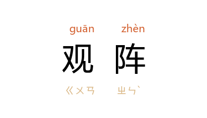 引西戎 《纠纷》:“其他男社员们,原先还是帮着 张老五 攻击妇女,后来见事情闹成这样,也都不敢说话了,悄悄站在一边观阵。”郭澄清 《大刀记》第六章:“那位观阵的指着 永生 脚上的鞋说:‘让你穿着这样的鞋打仗,我们没尽到自己的责任,真对不起你们!’”