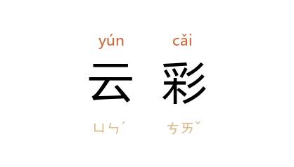 引《汉武帝内传》:“﹝ 上元夫人 ﹞服青霜之袍,云彩乱色,非锦非绣,不可名字。”《艺文类聚》卷七三引 隋 江总 《玛脑盌赋》:“士衡 譬之云采,中郎羞其马勒。”前蜀 杜光庭 《墉城集仙录·薛玄同》:“十五日夜,云彩满空,忽尔雷电。”艾青 《光的赞歌·烧荒》:“腾起的烟在阳光里,像层层绚丽的云彩。”