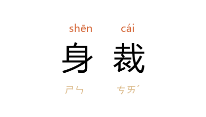 引唐 罗虬 《比红儿诗》:“魏帝 休夸 薛夜来,雾綃云縠称身裁。”《二十年目睹之怪现状》第八五回:“他生得唇红齿白,瘦削身裁。”邹韬奋 《萍踪寄语》七四:“这个博物馆的馆长是个三十几岁的女子,生得很体面,身裁颀长。”