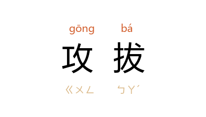 引《后汉书·荀彧传》:“古人尚帷幄之规,下攻拔之力。”宋 司马光 《涑水记闻》卷二:“俶 为朝廷攻拔 常州。”范文澜 蔡美彪 等《中国通史》第三编第四章第一节:“吐蕃 以生 羌 为向导,攻拔 安戎城。”