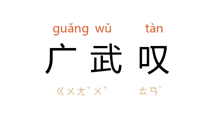 ⒈ 广武,在今河南省荥阳县境。秦末,楚汉两军隔广武而阵,项羽、刘邦曾于此地谈判。阮籍登广武城,感叹当时世无英才,竟使刘邦得志。见《三国志·卷二一·魏书·王粲传》裴松之注引《魏氏春秋》。后人遂以广武叹比喻怀才不遇,或感叹世无英雄,小人得志之意。宋·苏轼〈甘露寺〉诗:「古今共一轨,后世徒辛酸,聊兴广武叹,不待雍门弹。」也作「广武叹」。