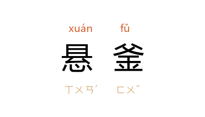 引《韩非子·十过》:“城中巢居而处,悬釜而炊,财食将尽,士大夫羸病。”明 唐顺之 《与王尧衢书》:“古人有言,人各有能有不能,悬釜带索,枯槁丘壑,虽穷死而不肯悔者。”