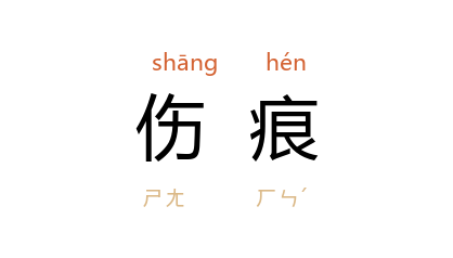 ⒈ 伤疤,也指物体受损害后的痕迹。