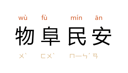 引《孤本元明杂剧·八仙过海·头折》:「如今尘世雍熙,圣人在位,风调雨顺,物阜民安。」《初刻拍案惊奇·卷二〇》:「莅任半年,治得那一府物阜民安,词清讼简。」