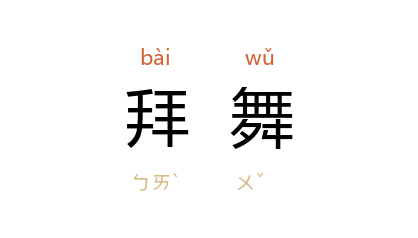 引汉 赵晔 《吴越春秋·勾践归国外传》:“羣臣拜舞天颜舒,我王何忧能不移。”唐 杜甫 《韦讽录事宅观曹将军画马图歌》:“盘赐将军拜舞归,轻紈细綺相追飞。”《前汉书平话》卷上:“﹝ 高皇 ﹞加四人官了,四人拜舞谢恩。”清 蒲松龄 《聊斋志异·局诈》:“见天子坐殿上,爪牙森立。某拜舞已。上命赐坐,慰问殷勤。”