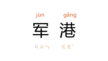 ⒈  停泊军舰的港湾。多利用天然地形建造,港内有造船场、船埠兵工场等,并筑有炮台等防御措施。