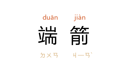 ⒈ 谓发箭瞄准时,以一目凝视目标。 元 马祖常 有《题<明皇端箭图>》诗。