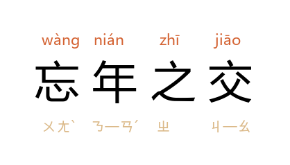 引《梁书·卷三四·张缅传》:「初未与缵遇,便虚相推重,因为忘年之交。」《三国演义·第一一一回》:「陈泰叹服曰:『公料敌如神,蜀兵何足虑哉!』于是陈泰与邓艾结为忘年之交。」