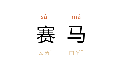 ⒈ 一种骑马赛跑的运动。人骑于马上,比赛骑马的速度而决定胜负。可分为无障碍赛马和障碍赛马。