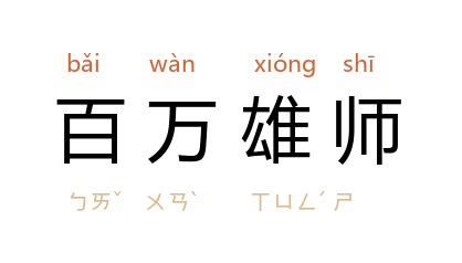 ⒈ 兵力众多,军威壮盛的军队。元·汤式〈小梁州·临风阁内〉曲:「谁承望擒虎将军至,拥貔貅百万雄师。」也作「百万雄兵」。
