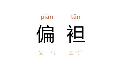 ⒊ 佛教徒穿袈裟,袒露右肩,以表示恭敬,并便于执持法器,亦称偏袒。