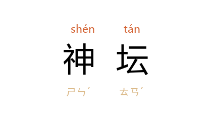 引南朝 齐 祖冲之 《述异记》:“豫章郡 有 卢松村,郡人 罗根生 於此村旁垦荒种瓜,又於旁立一神坛。”《旧唐书·礼仪志三》:“郊祀既毕,收取玉帛牲体,置於柴上,然后燔於燎坛之上,其坛於神坛之左。”老舍 《神拳》第四幕:“于铁子 :‘先生,好先生!扶我一下,我给神坛磕个头再死!’”