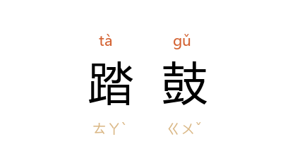 ⒉ 古时歌舞,着革履踏行鼓上,谓之踏鼓。