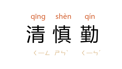 引《三国志·魏志·李通传》“以宠异焉” 裴松之 注引 晋 王隐 《晋书》:“﹝ 李秉 ﹞尝答 司马文王 问,因以为《家诫》曰:昔侍坐於先帝,时有三长吏俱见。临辞出,上曰:‘为官长当清,当慎,当勤,修此三者,何患不治乎?’”后用以为官箴。衙署公堂多书“清慎勤”三字作匾额。 梁启超 《新民说·论公德》:“近世官箴,最膾炙人口者三字,曰:‘清、慎、勤。’”