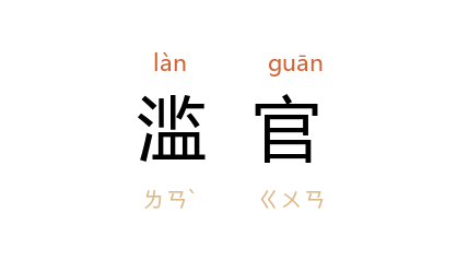 引《水浒传》第五八回:“滥官害民贼徒!把我全家诛戮!今日正好报仇雪恨!”《水浒传》第六五回:“盖为朝廷不明,纵容滥官当道,污吏专权,酷害良民,都情愿协助 宋江,替天行道。”清 程穆衡 《水浒传注略》:“滥官, 宋 时口语,以居官纵淫为滥。”