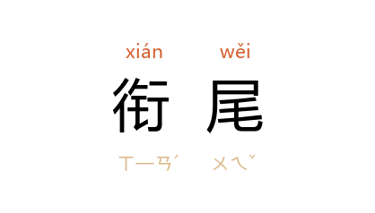 衔尾。谓前后相连接。啣,马嚼子;尾,马尾。 《痛史》第八回:“等了良久,方见一行韃兵,骑着马,啣尾而来。”