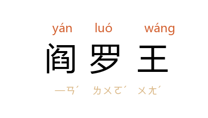 引《百喻经·贫人作鸳鸯鸣喻》:“临命终时,方言今我欲得修善。狱卒将去付 阎罗王,虽欲修善,亦无所及已。”《隋书·韩擒虎传》:“生为上柱国,死作 阎罗王,斯亦足矣。”沈从文 《从文自传·我读一本小书同时又读一本大书》:“我还得经过一家扎冥器出租花轿的铺子,有白面无常鬼,蓝面 阎罗王,鱼龙轿子,金童玉女。”