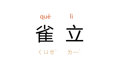 ⒈ 犹鹤立。竦身而立。雀为“隺”字之讹。《战国策·楚策一》:“﹝棼冒勃苏﹞七日而薄秦王之朝,雀立不转,昼吟宵哭。”朱祖耿集注引王引之曰:“雀当为隺字之误也。隺与鹤同。鹤立,谓竦身而立也。《文选·求通亲亲表》'实怀鹤立企伫之心',李善注引此策:'鹤立不转。'《初学记·人事部》、《太平御览·人事部》引此并与《文选》注同。《鸿烈·修务篇》曰:'申包胥(即棼冒勃苏)鹤跱而不食,昼吟宵哭。'皆其明证。”一说犹雀跃。鲍彪注:“雀立,踊也。”