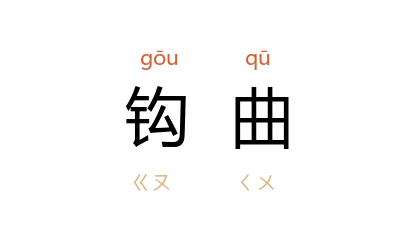 引晋 葛洪 《抱朴子·名实》:“插株於涂要者,虽鉤曲戾细而速朽,而犹见用也。”唐 陆龟蒙 《雪衣女》诗:“嫩红钩曲雪花攅,月殿栖时片影残。”清 纪昀 《阅微草堂笔记·姑妄听之二》:“髮蓬鬙如羽葆,手足皆鉤曲如鸟爪。”