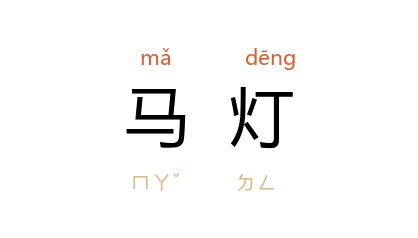 ⒈ 一种手提照明用的煤油灯。因最初的设计是为提供骑马的人夜行照明用,故称为「马灯」。这种灯的灯罩非常讲究,无风雨吹灭之虞。灯罩外也有钢丝圈的保护,可免碰撞,挂在马上,使用方便。