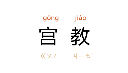 ⒉ 宋 代宫学的教授。 宋 陆游 《剑南诗稿》卷一有《送陈德邵宫教赴行在二十韵》诗。参阅 宋 高承 《事物纪原·三省纲辖·宫教》。参见“宫学”。