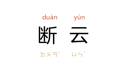 引南朝 梁简文帝 《薄晚逐凉北楼迥望》诗:“断云留去日,长山减半天。”宋 赵师秀 《会景轩》诗:“断云分树泊,饥鹤下田行。”明 边贡 《出郭将访希准郡伯薄暮而返却寄》诗:“断云低白雁,斜日近青山。”王横 《春感用黄仲则韵》之二:“彩凤倦飞求木集,断云恋岫绕山行。”