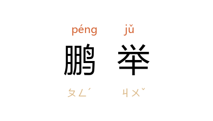 引三国 魏 曹植 《玄畅赋》:“希鹏举以摶天,蹶青云而奋羽。”唐 元稹 《答姨兄胡灵之见寄五十韵》:“迅拔看鹏举,高音侍鹤鸣。”清 方文 《李士雅江上见访谈粤中事甚详感而有作》诗:“怪尔艰辛还故国,不争鹏举慕鸡栖。”
