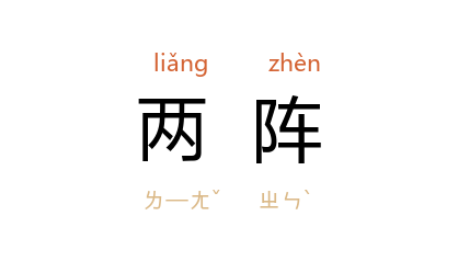 引《汉书·晁错传》:“两陈相近,平地浅屮,可前可后,此长戟之地也,剑楯三不当一。”《三国志·吴志·孙策传》:“举 江东 之众,决机於两陈之间,与天下争衡,卿不如我。”《元史·博罗欢传》:“今两阵相对,岂容先动?”梁启超 《新民说》第八节:“譬之两阵交绥,同队之人皆赌生命以当公敌,而一人独贪安逸,避竞争,曳兵而走焉。”