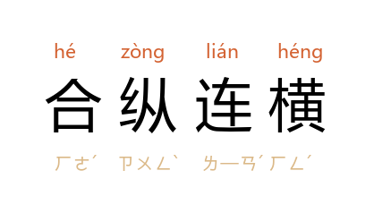 ⒈ 战国后期各国图存争强的一种策略。合纵指弱国联合对付强国,即齐、楚、燕、赵、韩、魏等国联合对抗强秦;连横指随从强国去进攻其他弱国,即依附秦国。一说六国南北相连为纵,合纵即六国联合抗秦;东西相连为横,连横即六国分别服从秦。苏秦、张仪等是著名纵横家。