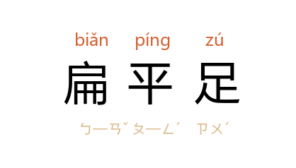 ⒈ 病名。一种足纵弓呈平坦的病。罹患此病,脚掌会向外侧旋转,以致足弓消失、脚心扁平,形成八字脚。症状为脚部疼痛、肿胀、痉挛、僵硬及步态笨拙。病因先天性、后天性皆有。