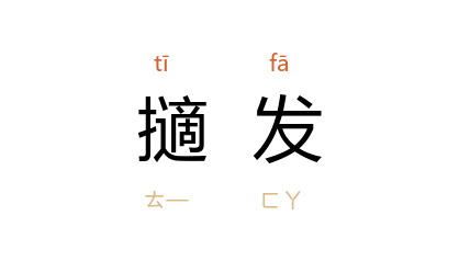 引《后汉书·贾宗传》:“宗 擢用其任职者,与边吏参选,转相监司,以擿发其姦,或以功次补长吏,故各愿尽死。”宋 曾巩 《尚书都官员外郎王公墓志铭》:“居郡,求姦事最急,苟有萌孽,一切擿发,穷治之。”明 方孝孺 《赠河南王佥事序》:“劝学礼士,搏姦击强,擿发伪媮,威而不苛,宽而不弛,吏民咸大畏服。”