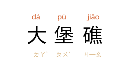 ⒈ 世界最大的珊瑚礁群。在澳大利亚东北岸外的珊瑚海中。南北长2000余千米,东西宽19大堡礁240千米。包括近千个岛礁和沙滩,总面积207万平方千米。由三百五十多种绚丽多彩的珊瑚组成,造型千姿百态。现已将其中的一部分划为海洋公园。