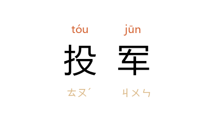 引《薛仁贵征辽事略》:「日当午时,见一白袍年少,分开人直走至帐下,某来投军。」《三国演义·第一回》:「快斟酒来吃,我待赶入城去投军。」
