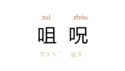 引《清史稿·广略贝勒褚英传》:“褚英 意不自得,焚表告天自诉,乃坐咀呪,幽禁。”黄远庸 《大小零星杂记》:“詬厉巖廊之上,咀呪庙堂之间。”丁玲 《韦护》第一章六:“他暴躁的咀咒这迟到的火车,而且在心上竟骂了一句不文雅的话。”