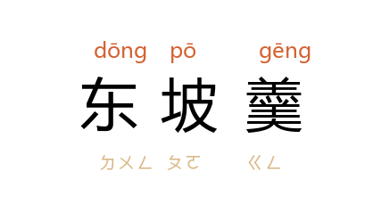 引宋 苏轼 《东坡羹颂》引:“东坡羹,盖 东坡居士 所煮菜羹也。不用鱼肉五味,有自然之甘。其法以菘若蔓菁若芦菔若薺,皆揉洗数过,去辛苦汁,以生油少许涂釜缘及瓷盌在菜汤中,入生米为糝。”宋 苏轼 《狄韶州煮蔓菁芦菔羹》诗:“我昔在田间,寒庖有珍烹,常支折脚鼎,自煮花蔓菁。中年失此味,想像如隔生。谁知南 粤 老,解作东坡羹。中有芦菔根,尚含晓露清。勿语贵公子,从渠嗜羶腥。”