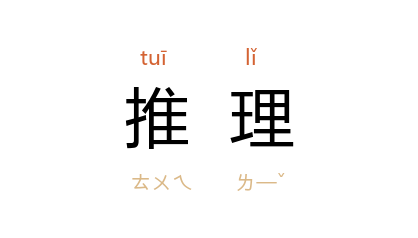 ⒈ 一种逻辑的思考方式。由已知或假定的前提来推求结论,或由已知的答案结果,反求其理由根据。凡由因以求果、由果以溯因、由现象以归其原理、以原理说明现象等,演绎、归纳、类比的思考活动,皆称为「推理」。现运用于心理学、犯罪学、侦办案件上,有很大的帮助。